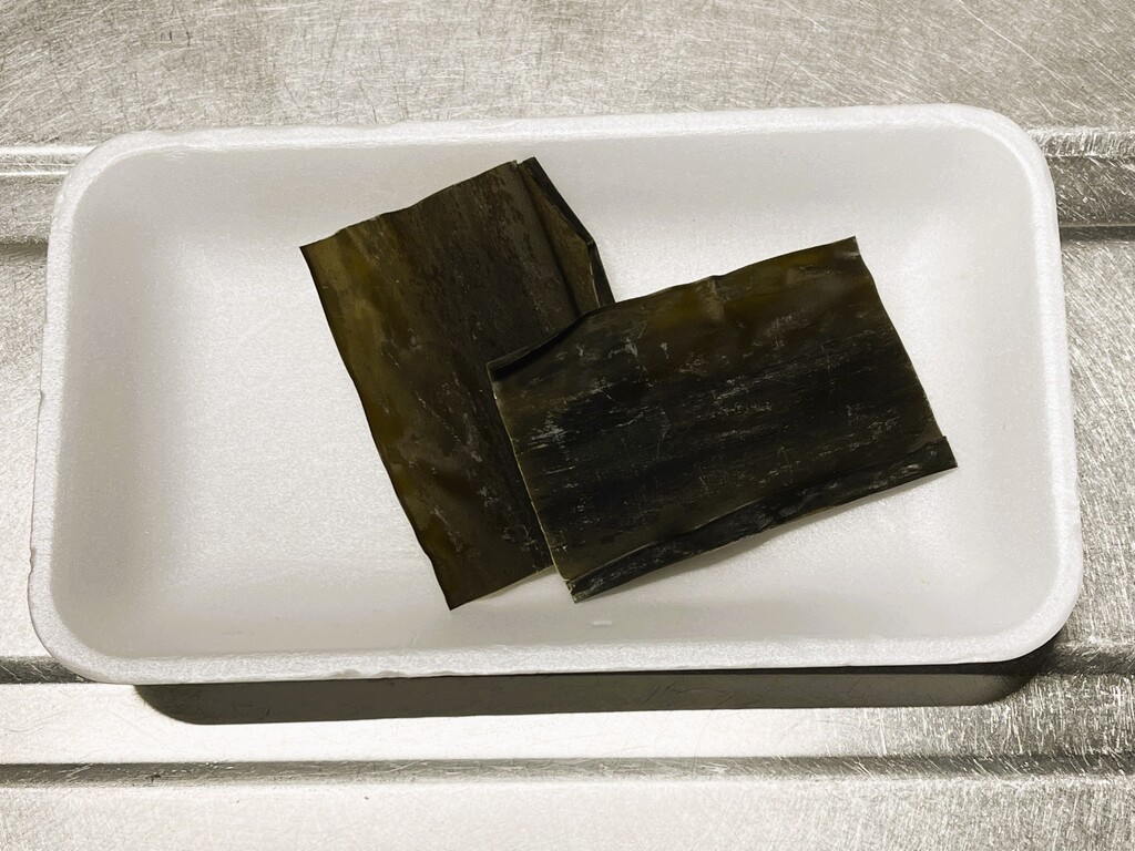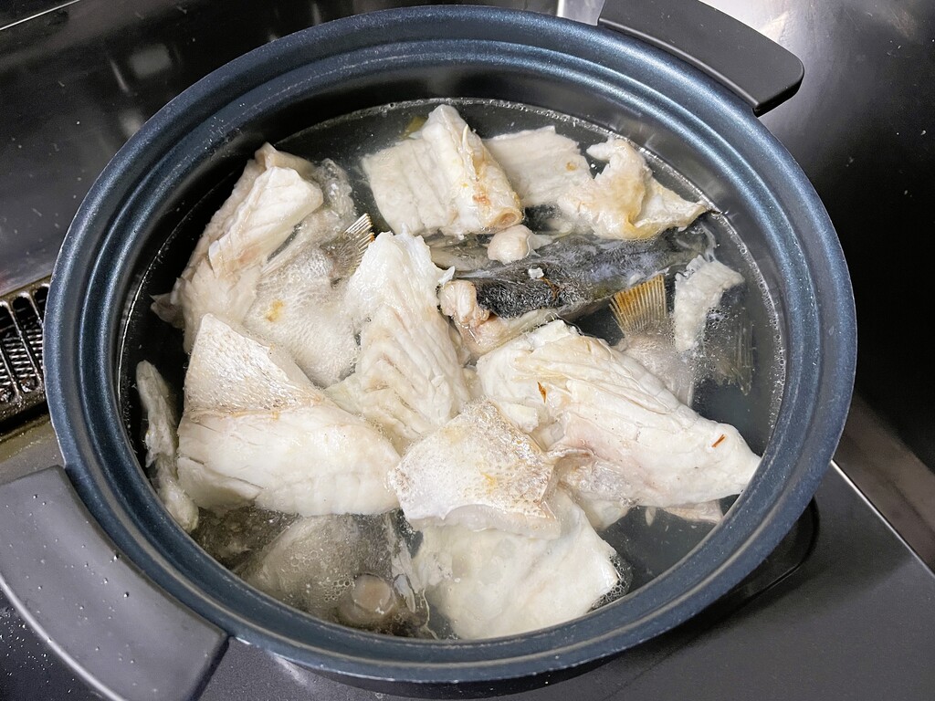 鍋に、この昆布と水、そしてスズキのアラを入れて弱火でじっくり加熱します。