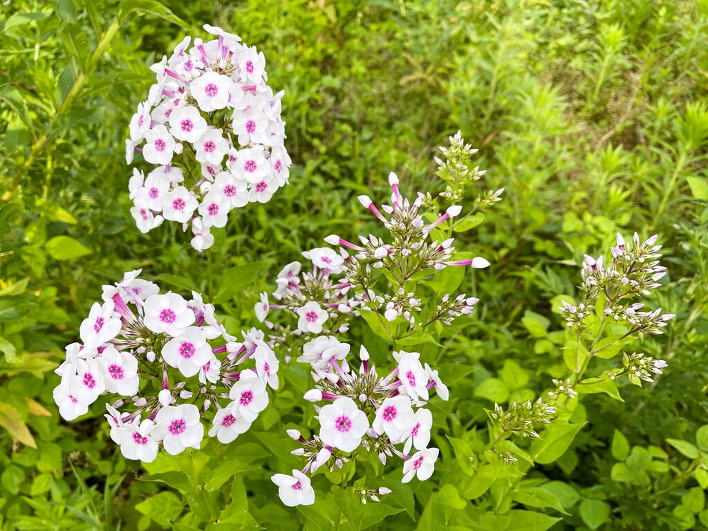 先日咲き始めた「オイランソウ(花魁草)」。「フロックス」とも呼ばれている花ですが、いろいろな色があちこちで見られるようになりました。
