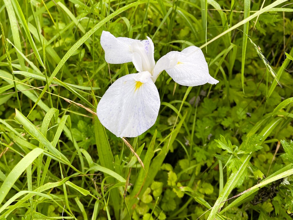 これまで「白いアヤメ」と紹介してきたのですが、よくよく調べてみるとどうやら「白いハナショウブ(花菖蒲)」が正解のようです。集団で咲いていましたが、見頃の時期が過ぎてしまったようで綺麗に撮れたのはこの一輪だけでした。