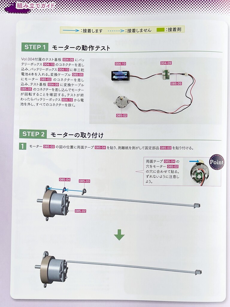 「今回送付したモーターがちゃんと動くかどうか、電池を繋いで確認してね」ということらしいです。この作業はアシェットさんの親切心なのか、それともモーターの品質に自信がないからなのか、いったいどちらなんでしょうね(笑) 私のヤツはとりあえずちゃんと動きましたわ(笑)