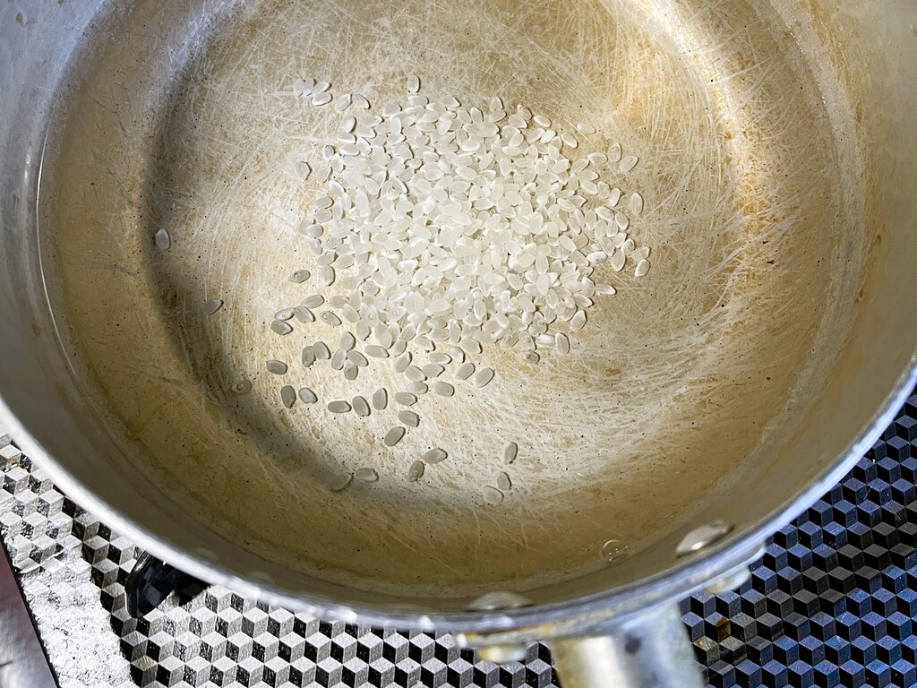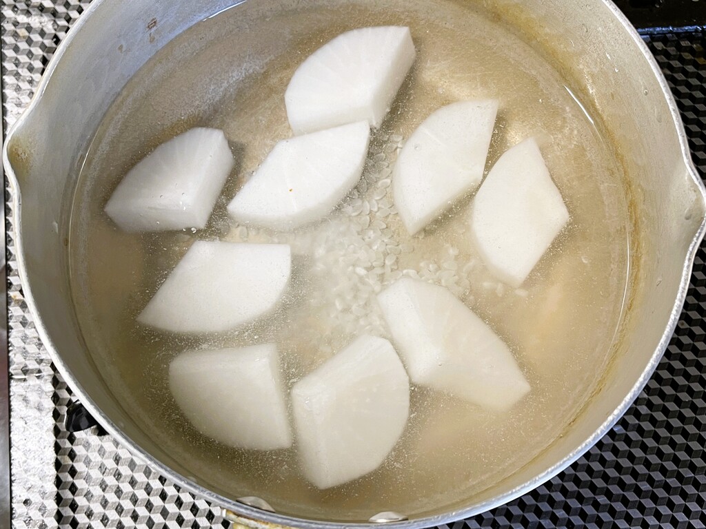 お米のとぎ汁がなかったので、代わりに米を少し入れた鍋で茹でていきます。