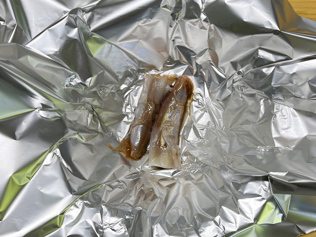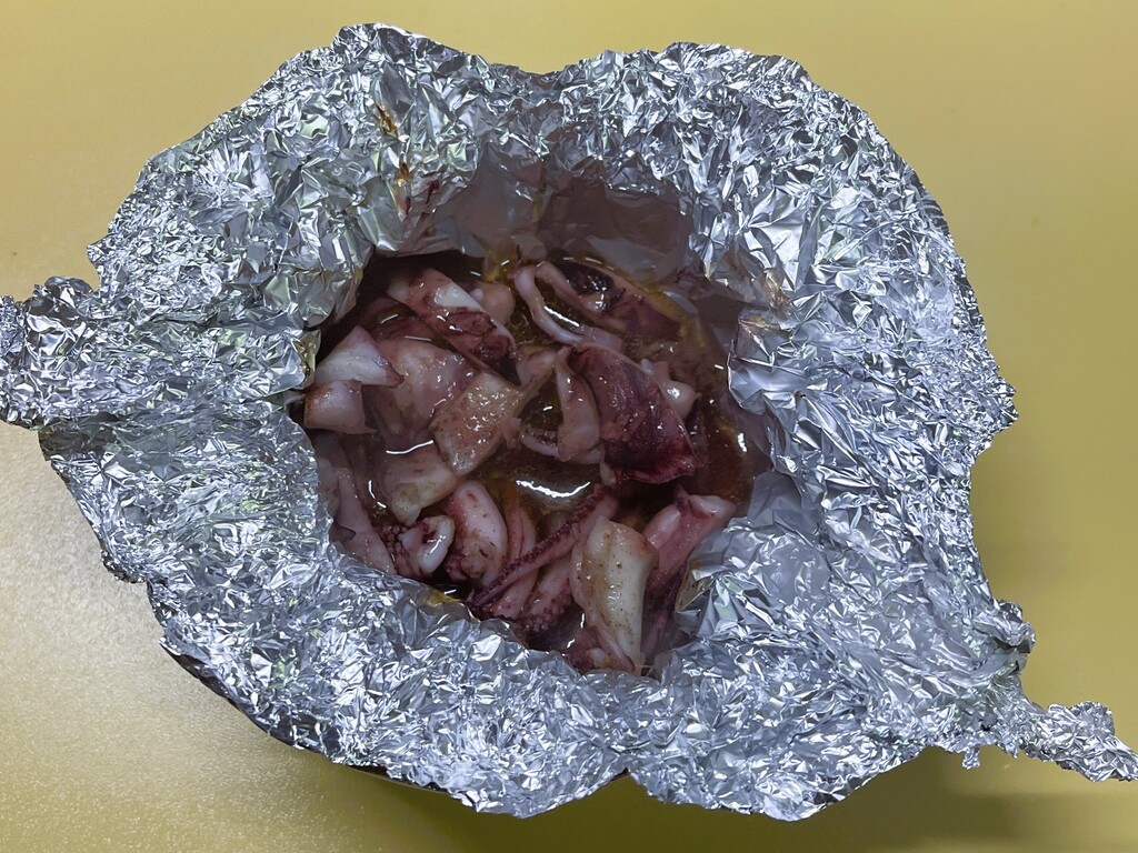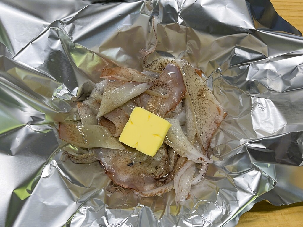 はい、3品目「残り物のイカワタホイル焼き」の完成で~す。