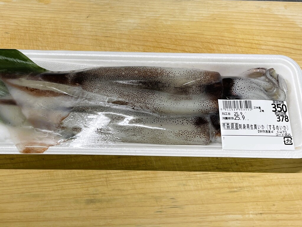 青森県産の刺身用の生真いか「するめいか」が2杯で350円! 大きさも良い感じでしたので即購入です。