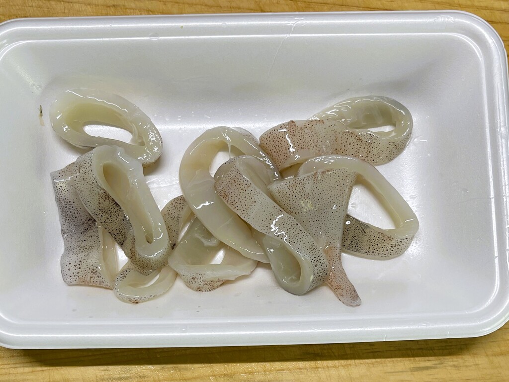 残っていたイカの耳の部分とゲソ、刺身を作ったときに残った端切れを使って作ります。
