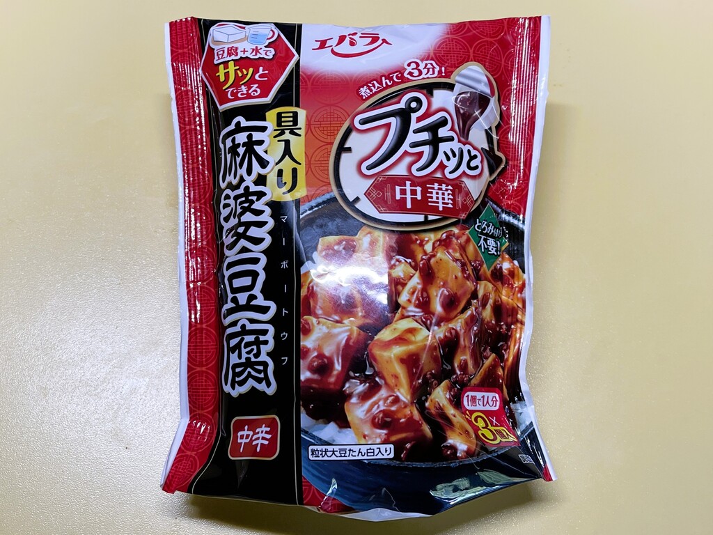 エバラ食品の「プチっと中華」シリーズの「麻婆豆腐」を使って作ります。これまで同シリーズの「回鍋肉」と「青椒肉絲」をご紹介してまいりましたが、この「麻婆豆腐」で「プチっと中華」コンプリートとなります(笑)
