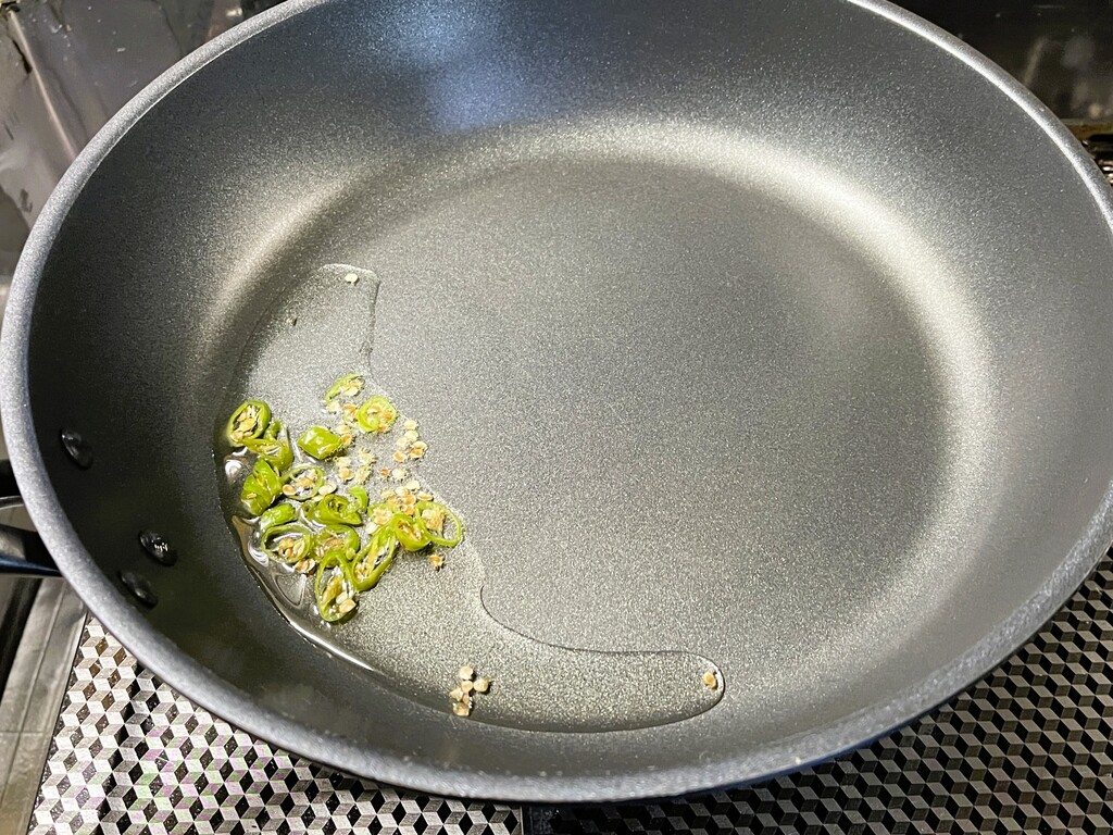 まずは油と青唐辛子を熱して辛さを引き出します。