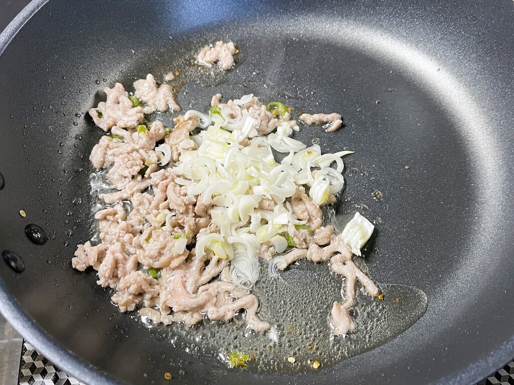 豚挽き肉に火が通ったら、白いネギを入れて更に炒めます。