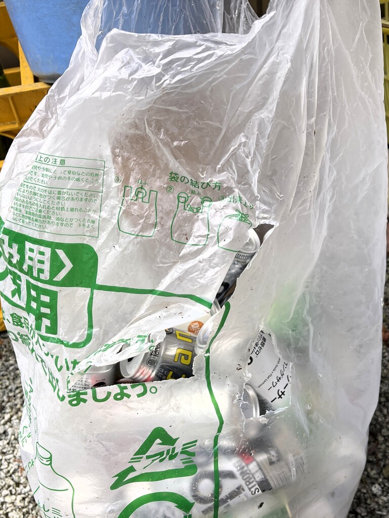 外に置いておいた空き缶の袋が、何者かに破られ中身が散乱していたのです。
