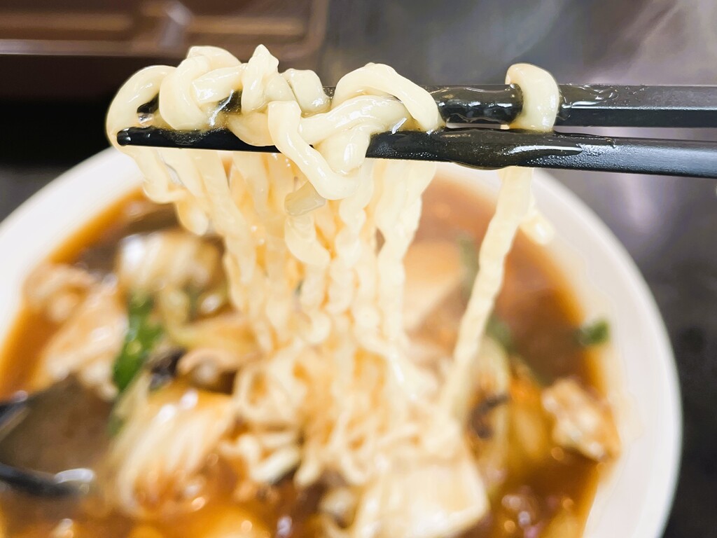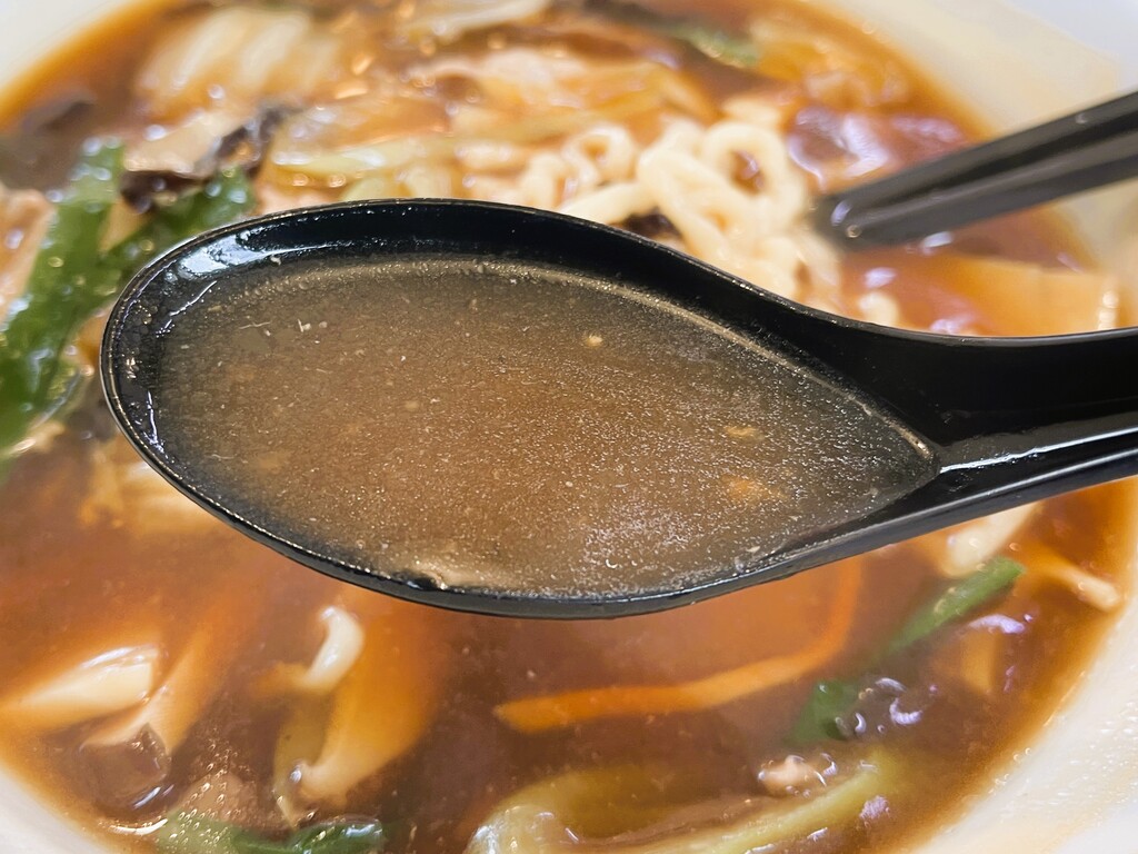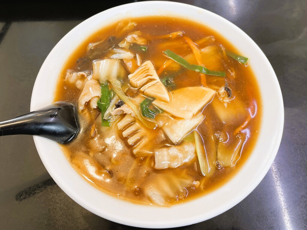「五目あんかけらーめん(税込1,010円)」です。すると、スーパー爺ちゃんも「おれもそいづ」と。通訳すると「私も同じもので」です(笑) ブログのネタのためには、スーパー爺ちゃんには私と違うヤツを食べてほしかったのですが、ここは無理強いはできません。親子仲良く同じものをオーダーしました(笑)