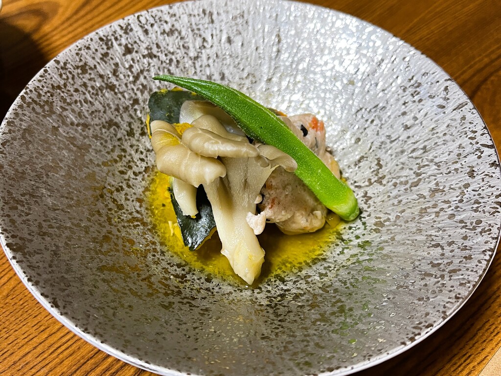 栗南瓜、舞茸、海老真丈、オクラ。