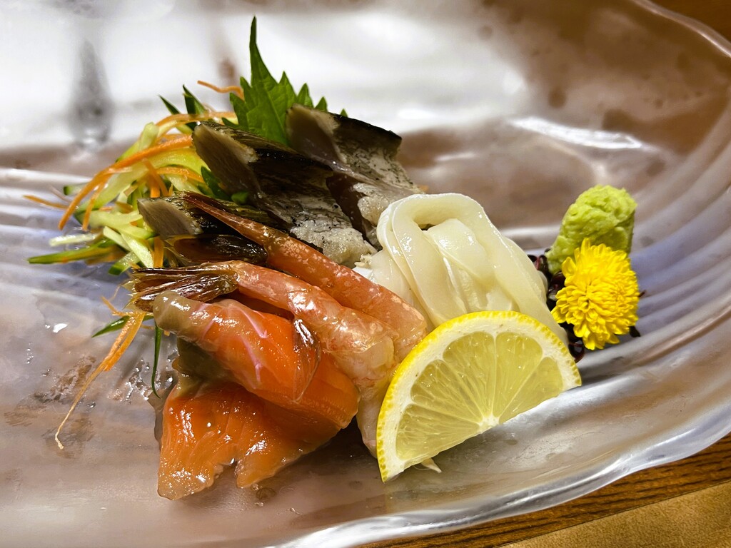 鮪タタキ、烏賊ソーメン、サーモン、甘海老。