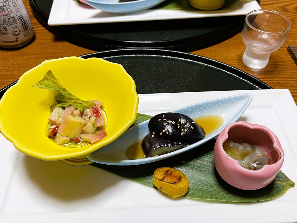 烏賊マリネ、焼栗甘露煮、秋茄子揚げ煮、蛸山葵。