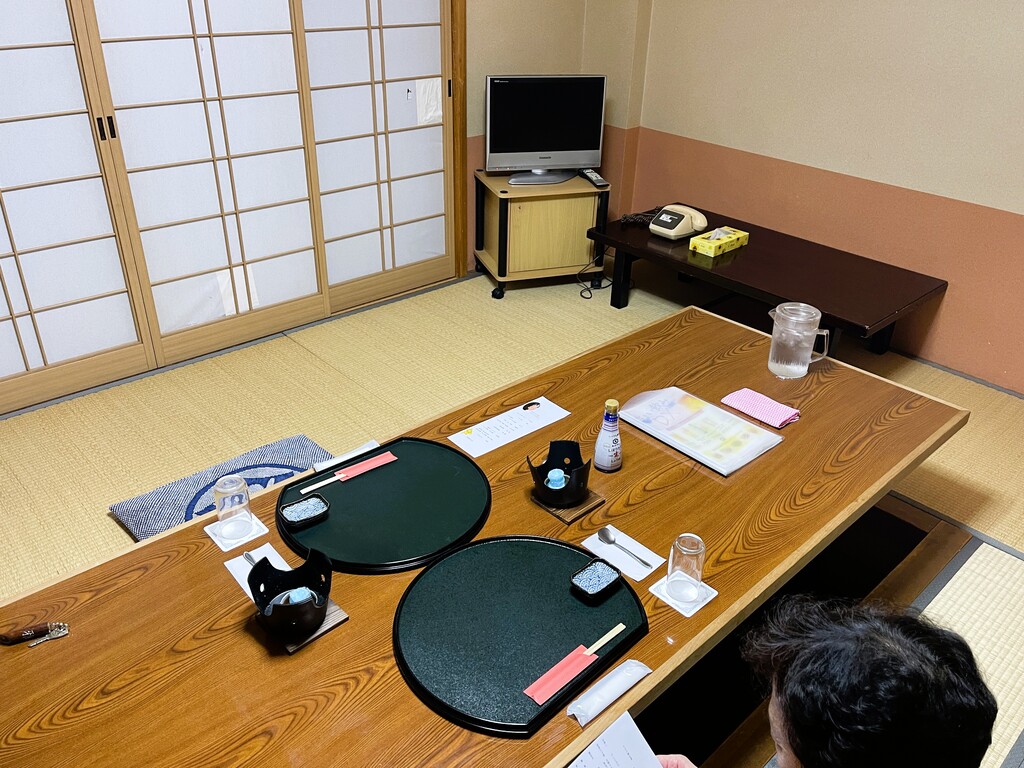 今回は2食付きのプランでしたので、夕食は本館の個室でいただきました。