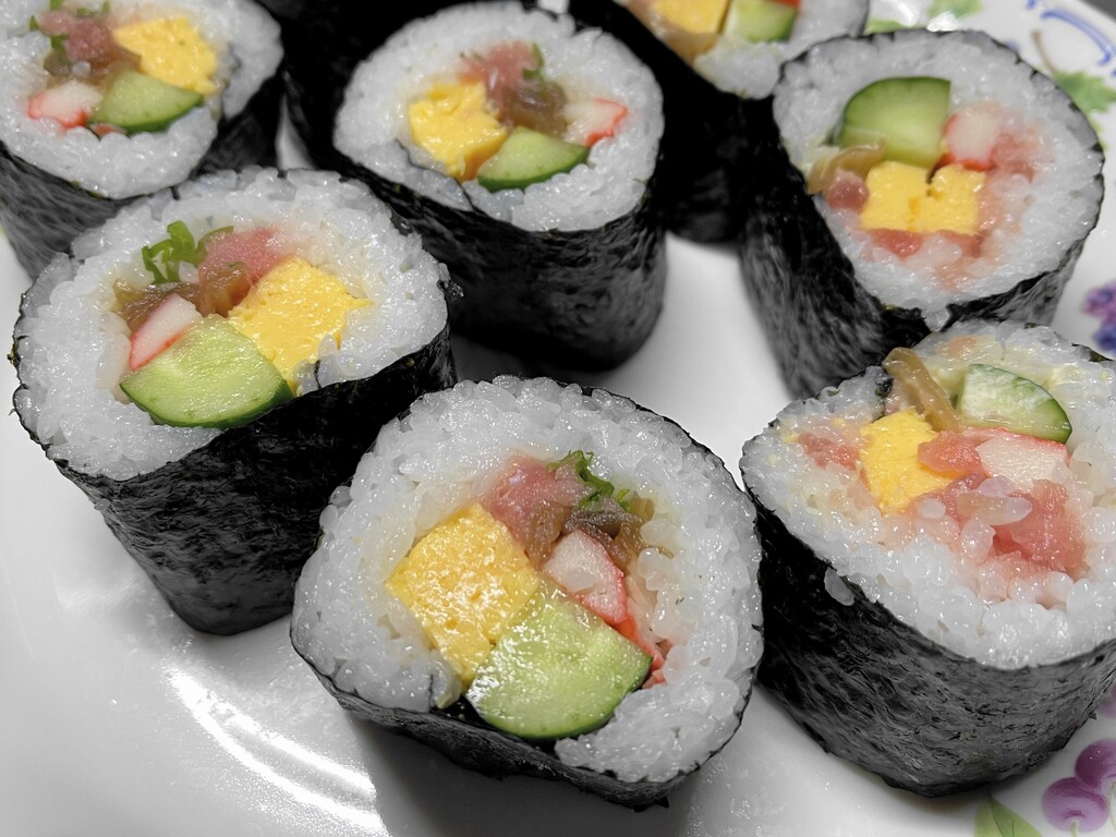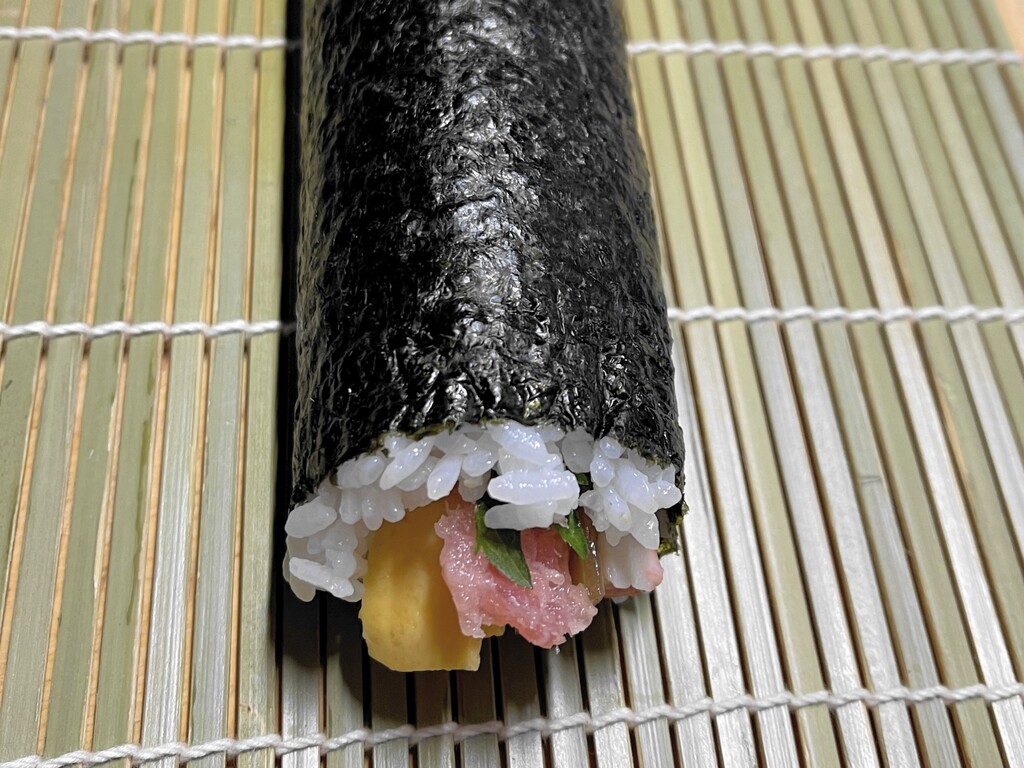 恵方巻は、福を巻き込むという意味を込めた巻き寿司のため、七福神にあやかり7種類の具が入った太巻きが望ましいとされているとか。そういう意味では今回ちゃんと7種類(キュウリ、玉子、カニカマ、ネギトロ、かんぴょう、シイタケ、ニンジン)使いました。