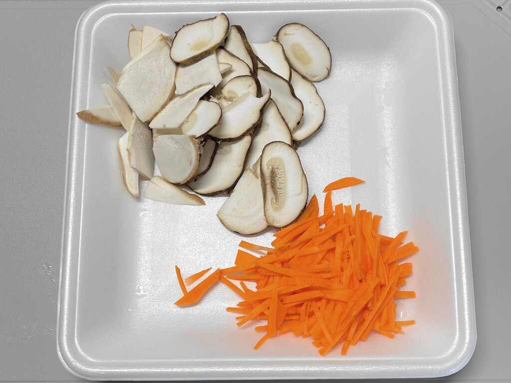 原木シイタケの傘と太い茎は薄切りに、ニンジンは千切りにしました。