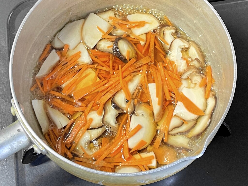シイタケとニンジンを入れて汁が少なくなるまで煮込みます。
