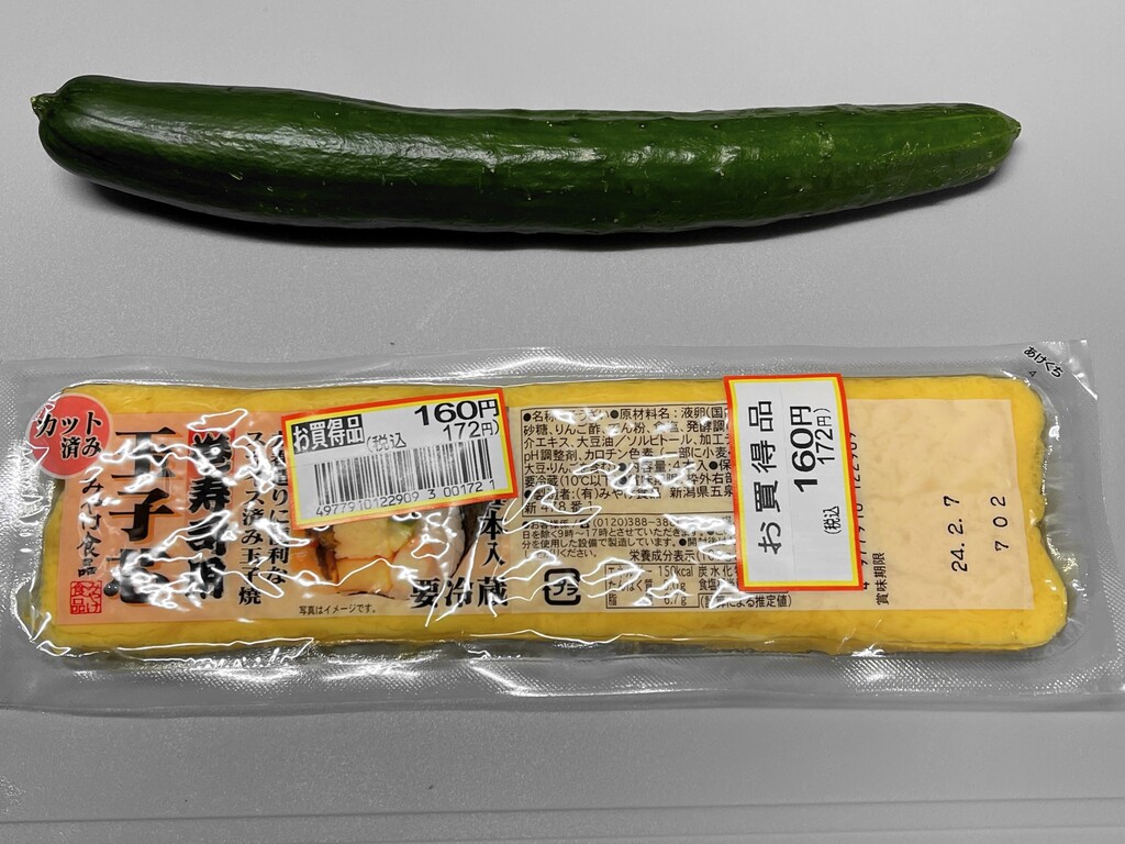 キュウリはなんと1本80円くらいしました。ぼったくりやん(笑) しかし、厚焼き玉子は消費期限が近いものが値下げになっていたのでそれをゲット。