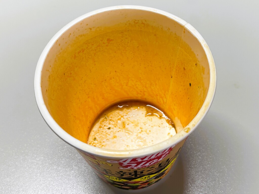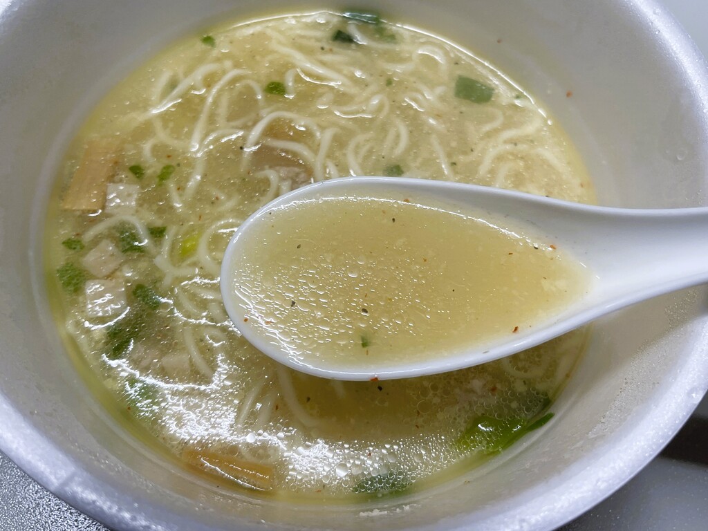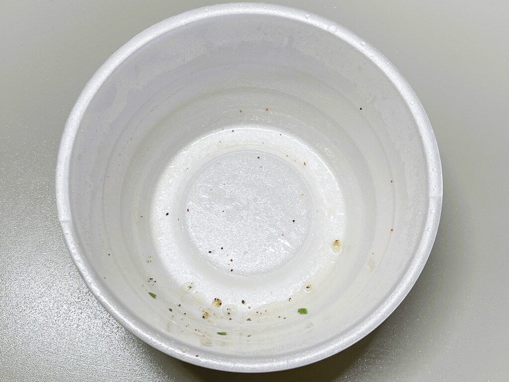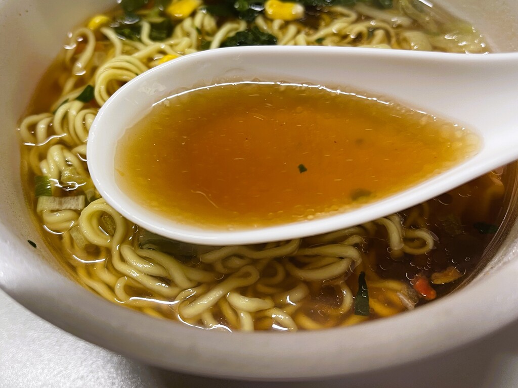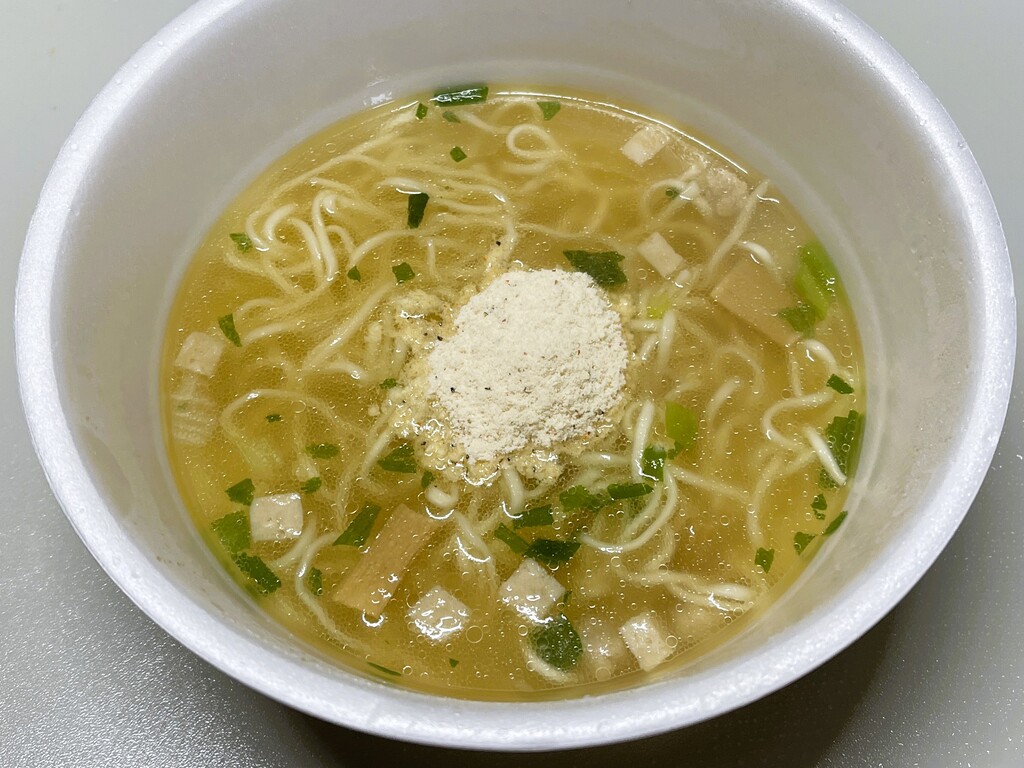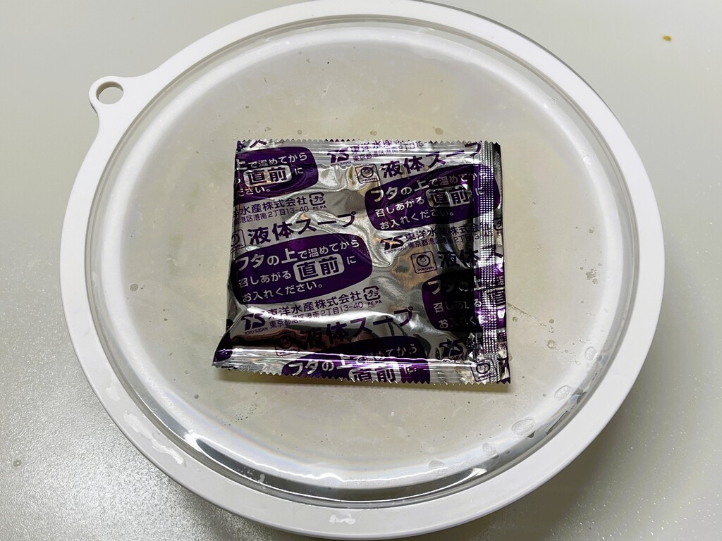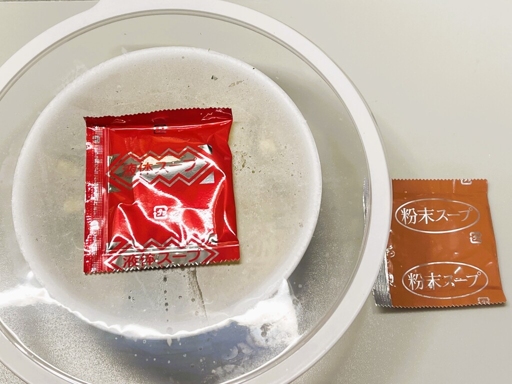 半分ほど食べたところで、作り方に書いてあったとおりに粉末スープを入れてみます。