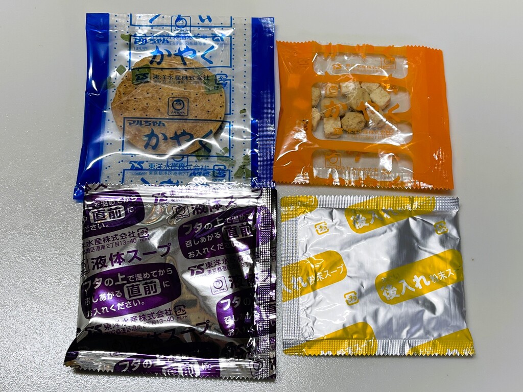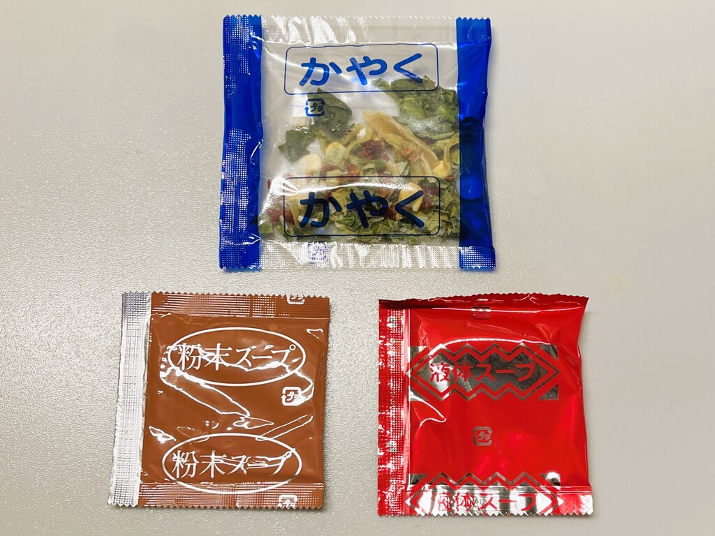 麺以外には「かやく」が2袋、液体と粉末のスープが各1袋入っていました。