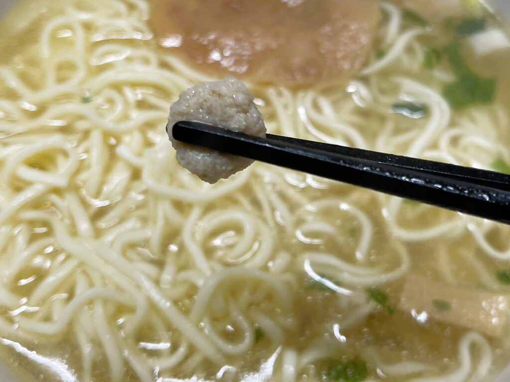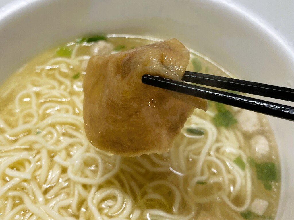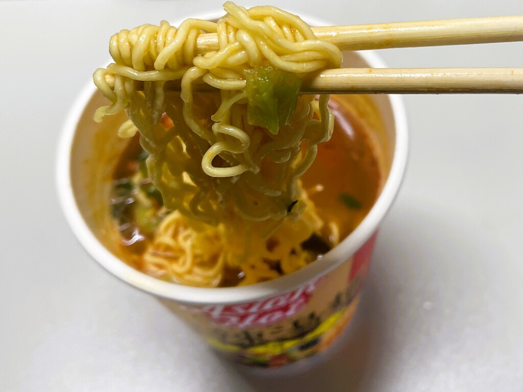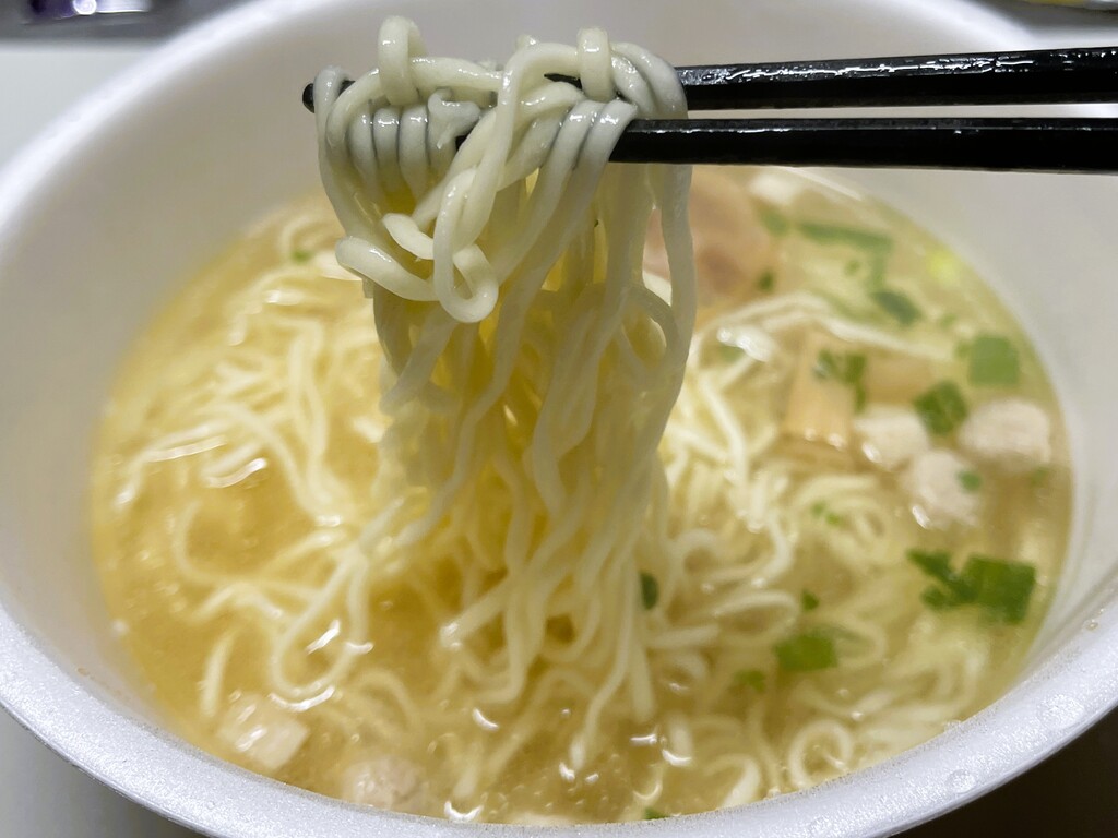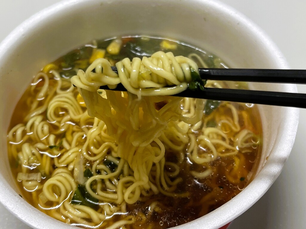 すっ、すごい!! これがカップ麺!? つるつるしていて、かつ適度な歯ごたえがあるこの麺は、正に生麺の食感。「かやく」を入れずにこの商品をラーメン用の器に盛って提供したら、これがカップ麺のものだと気付く人は少ないんじゃないかな。
