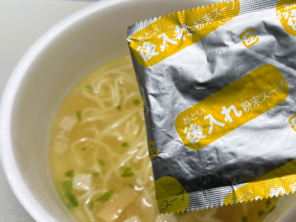 粉末スープは、出来上がったカップ麺を半分ほど食べてから投入することで、味編を楽しむもののようです。